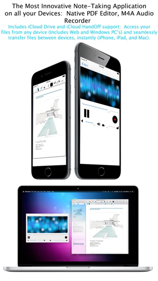 Mach Note is the most innovative, flexible, compatible, and powerful Note-Taking application! Mach Note features Freehand Notes in a Native PDF format, Audio recording in a Native M4A format, and Word processing in RTF format. Using the PDF format, Freehand Notes are synced across all your devices (via iCloud) so you always have the latest version of your Notes with you — regardless of device. And since Mach Note uses the PDF format, you can annotate PDFs with powerful Note-taking tools *and* your Notes are ready for Mobile, Desktop, Web, and Print right from the get go: No more manually exporting notes and uploading files — Mach Note handles everything for you! Mach Note also lets you record Audio using your device’s built in microphone, and you can see your Audio with our stunning 3D Visualizer which works for both Recording and Playback. As well as being super easy to use; with all these features Mach Note gives you with an unparalleled Note-taking experience. And best of all, Mach Note is free for iOS and only $4.99 (U.S.) for OS X!