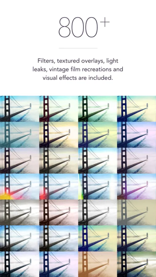 You don’t take photos with Filters. You transform them. Filters has over 800 ways to transform your photographs including: fully adjustable authentic vintage film recreations, hand-painted textures, vibrant colored gel overlays, special multi-effect adjustments, as well as standard image adjustment tools like brightness, contrast, color temperature, exposure and more.