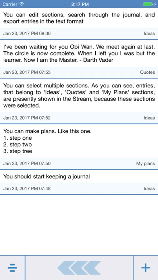 The main function of this app is to let you capture the events and experiences of your life, record unique thoughts and ideas, set goals for the future and solve tricky problems. This journal is all about simplicity. It has no bells and whistles in it, only the necessary functionality. It has two main parts to it. One is the ‘Stream’ of your entries. Another is ‘Sections’.
