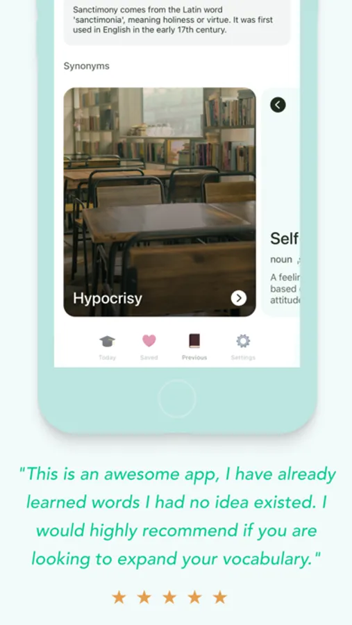 Whether you're a native English speaker preparing for exams like the SAT, GRE, or membean, an ESL learner preparing for IELTS, TOEFL, or magoosh, or simply someone who loves learning new words, "Word of the Day - Daily Vocab" has something for you. Our in-house editorial team provides daily word features to keep you engaged, and you can customize the app to receive notifications at a time that's convenient for you. Plus, you can store your favorite words in your own word collection.