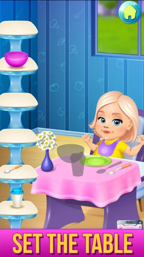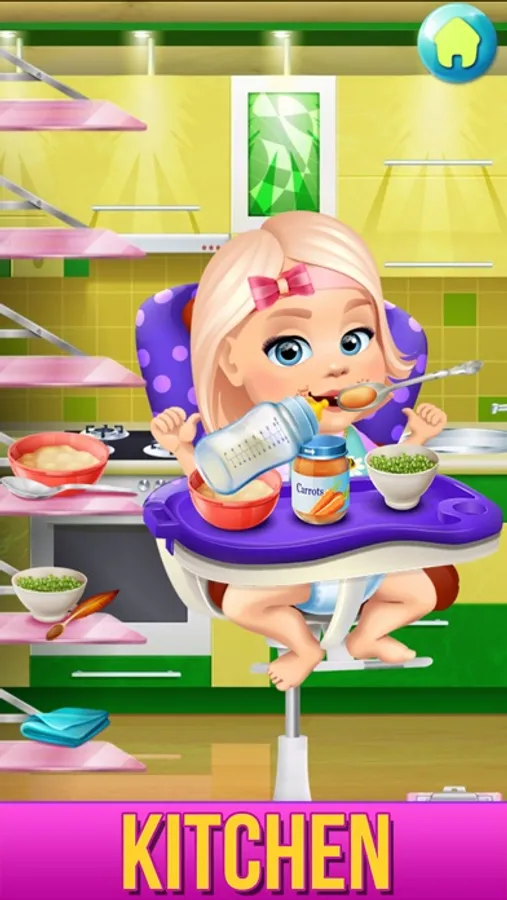 Level 1: Feed the cute & hungry baby in the kitchen. Change different bibs, then give a milk bottle, feed apple sauce, baby food and more! yummy!