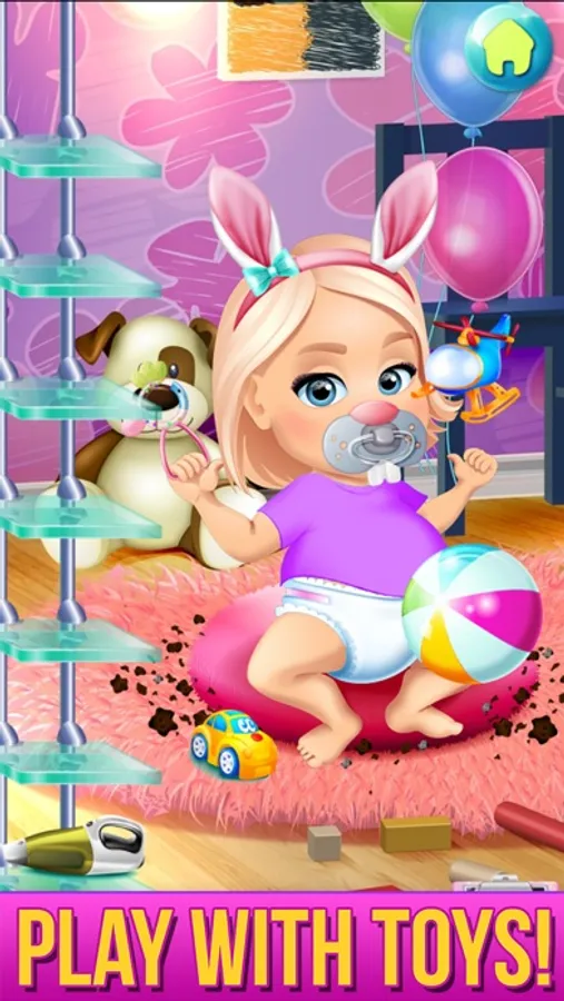 Level 4: Play room! Play with a rattle, new yellow toy car, red helicopter, bouncing ball and do bunny makeover!