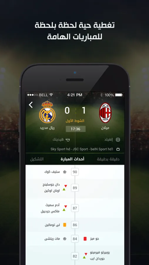 إمكانية مشاركة تحديثات المباريات و الأخبار على فيسبوك و تويتر