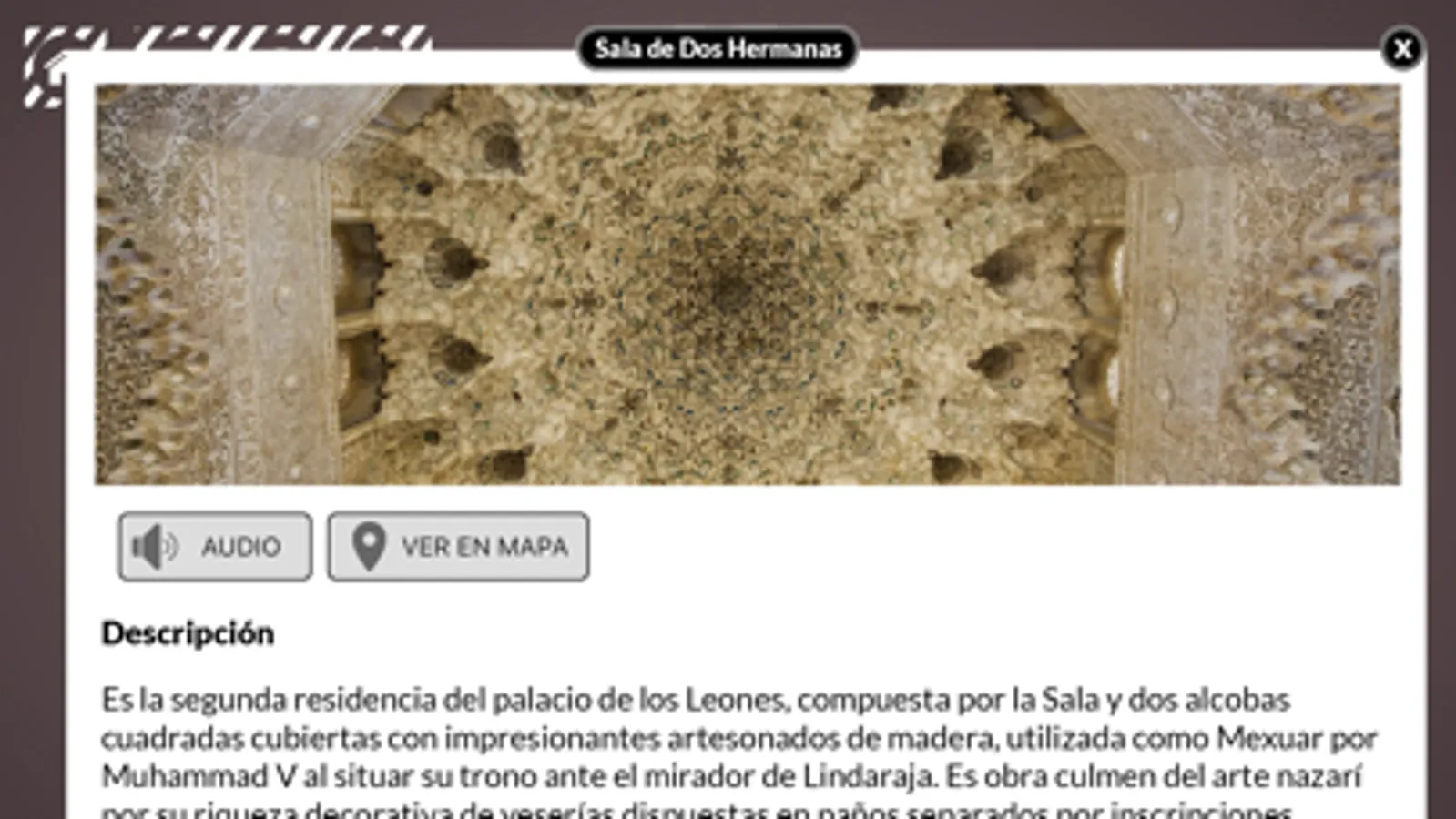 A handy guide and an audio app of Nasrid Palaces of the Alhambra of Granada in a one device, your own phone!. Entertaining and intuitive, the only way to know each palace and each patio of these palaces of the Alhambral during your visit. You will also have a memory forever of what you've seen and it costs less than a cup of coffee.