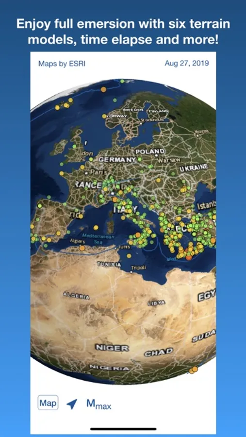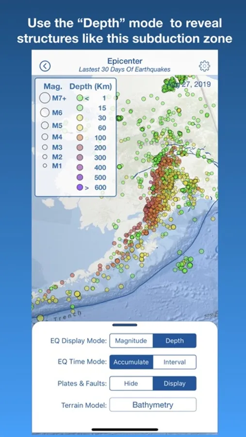 -- Tap an epicenter for details about the earthquake including magnitude, depth and source