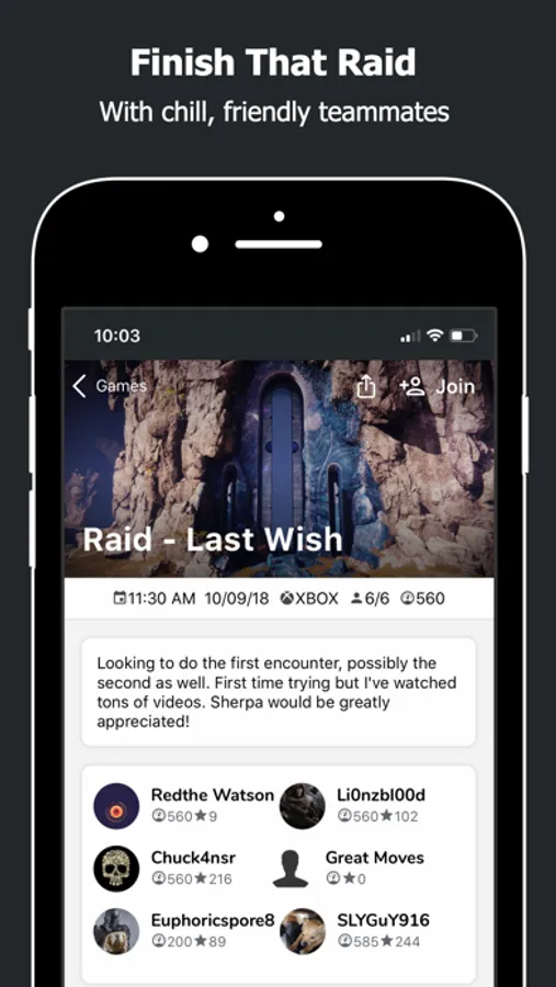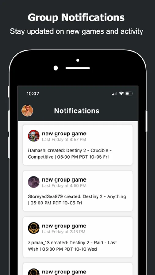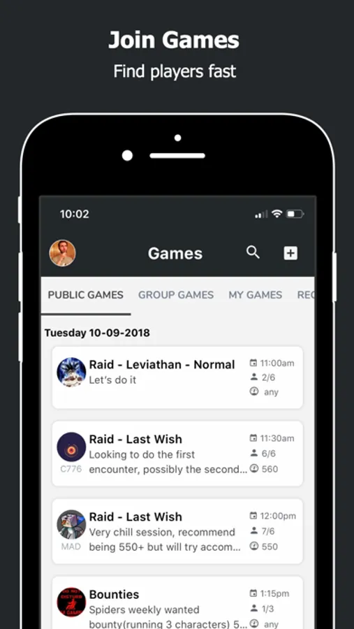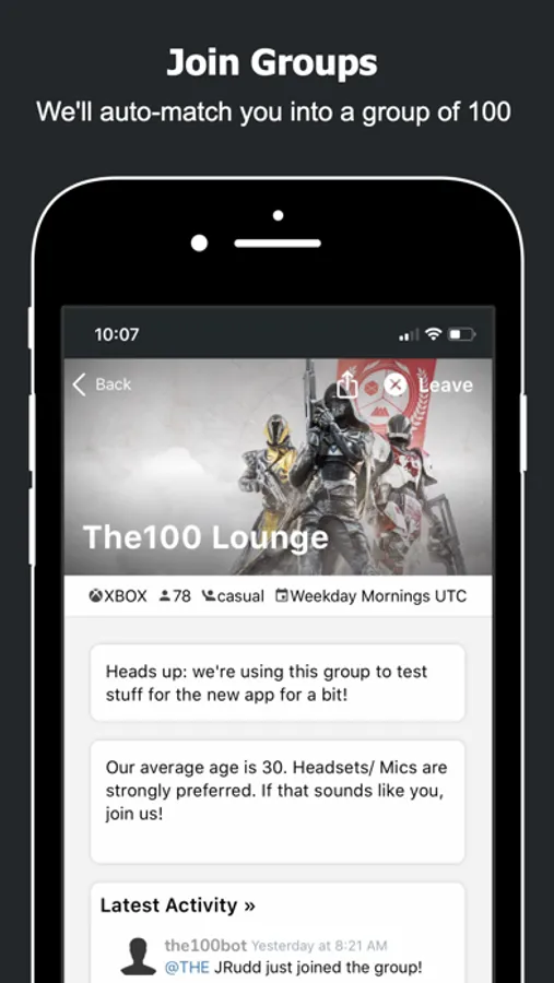 3. Play games like Destiny 2, The Division2 , Anthem, Apex Legends and more! You'll always have a group of 100 fun, chill people you can play with and get to know. Get mobile notifications of upcoming gaming sessions, realtime chat with your group, and more.
