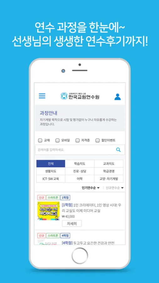 본 앱을 통해 한국교원연수원에서 서비스 중인 과정안내 및 온라인강좌를 수강하실 수 있습니다. 단, 스마트폰에서 지원하는 과정만 수강이 가능합니다.
