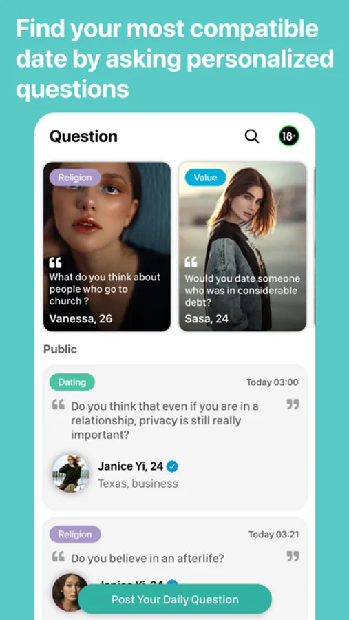 - Get to know how potential partners feel about relationships with the help of in-app questions!