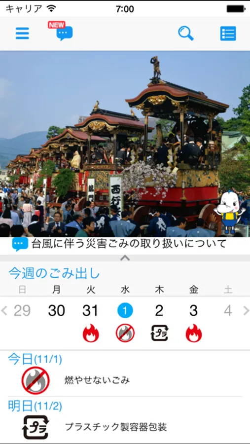 収集日に関するお知らせやイベント情報など、市からのごみに関するお知らせを確認することができます。