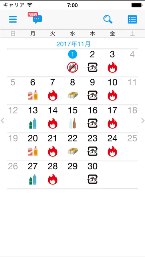 今日と明日、週ごと、月ごとの3パターンによるごみ収集日程を一つの画面ですぐに確認することができます。
