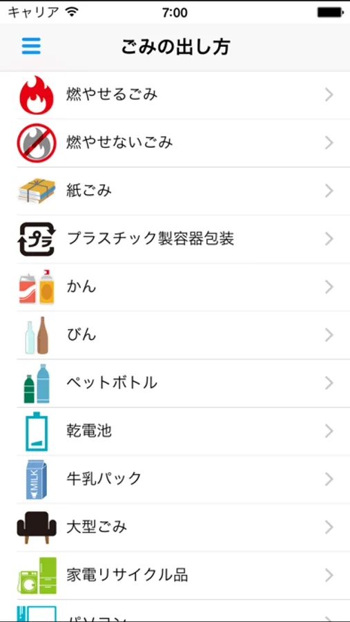 品目毎にごみの捨て方を確認できます。また、五十音順検索や文字入力検索ができるため、探しているモノを簡単に見つけることができます。