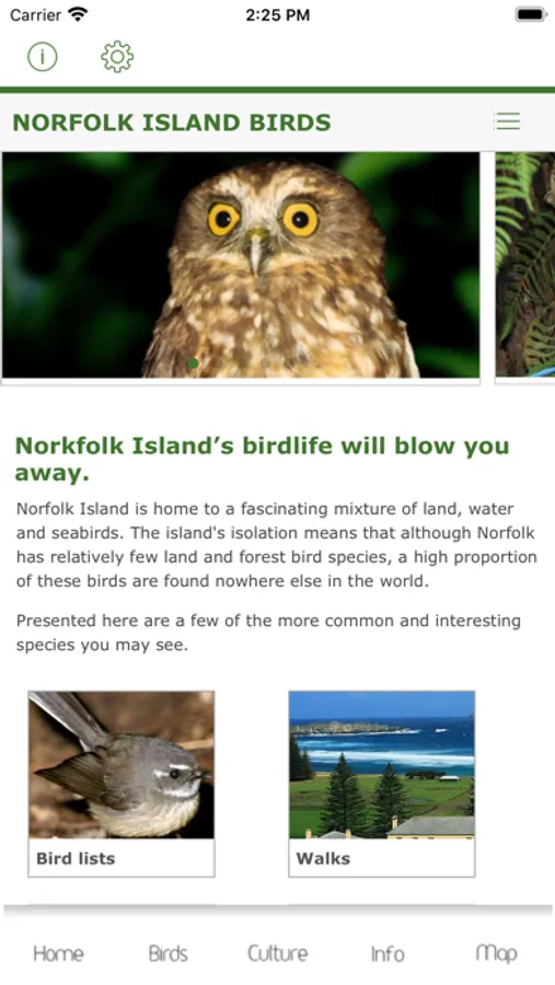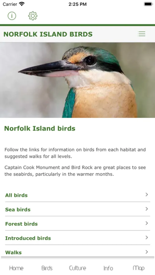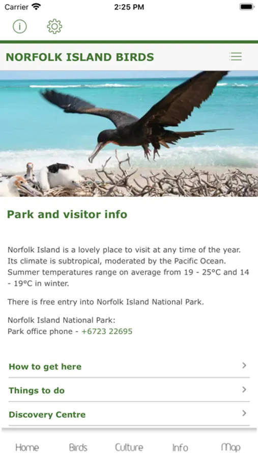The island's isolation means that a high proportion of these birds are found nowhere else in the world. Use this app to discover some of Norfolk's birdlife by exploring the images, bird calls and detailed descriptions of nearly 30 birds. Included is information on walks where you are likely to see abundant birdlife and some itineraries to help you make the most of your time at Norfolk Island.
