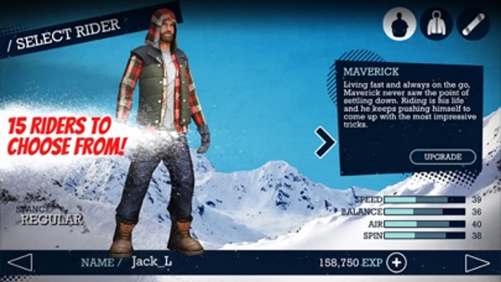 • Play often to gain experience and upgrade your favorite snowboarder’s attributes.