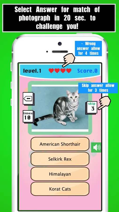 Dog Breed Quiz, Cat Breed Quiz is Quiz for test your knowledge. How many breeds of Dog&Cat do you know? Game consists of 164 dog breeds and 49 cat breeds of question & photographs.