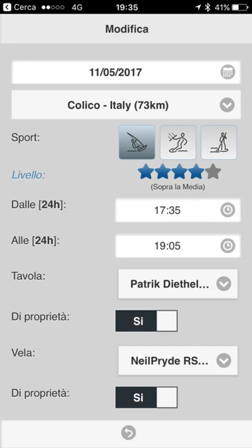 2- Fulfill mandatory parameters (spot, sport type, board, sail, your weight, vote)