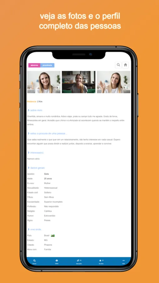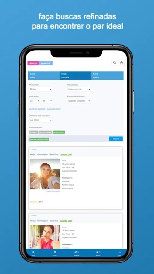 Filtre sua busca por afinidades, características físicas, escolaridade, pessoas próximas e muito mais.