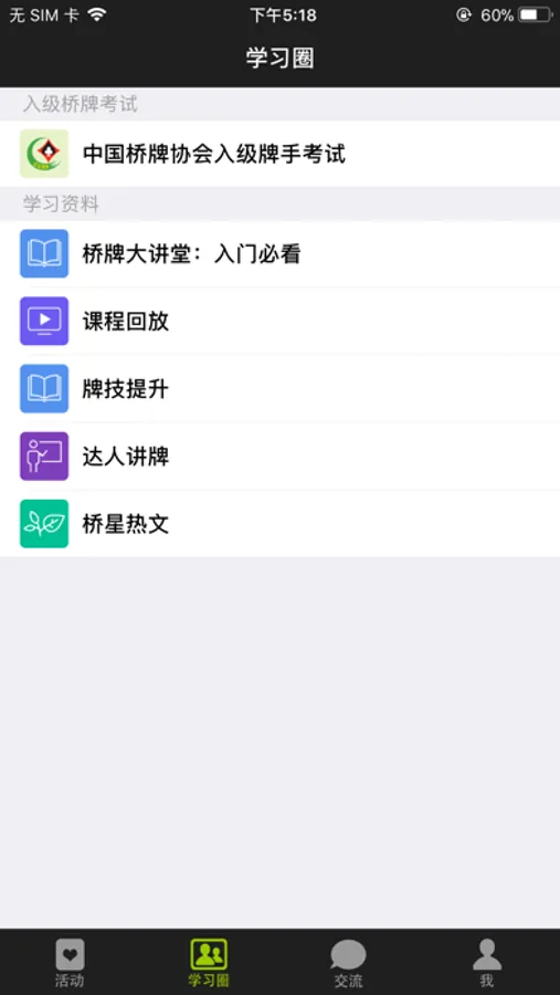 学习圈栏目包括着众多桥牌学习资料,给桥牌爱好者提供丰富的桥牌资料,包括做庄和防守技巧、桥牌教学视频、桥牌圈内的文章等。