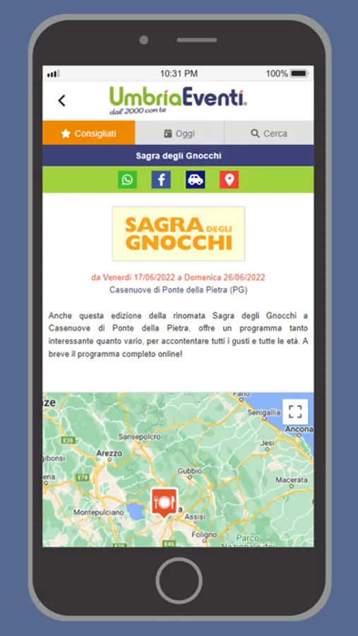 Per ogni iniziativa è possibile consultare date di svolgimento, programma, informazioni, curiosità ed attivare la funzione di Navigatore per raggiungere la località.