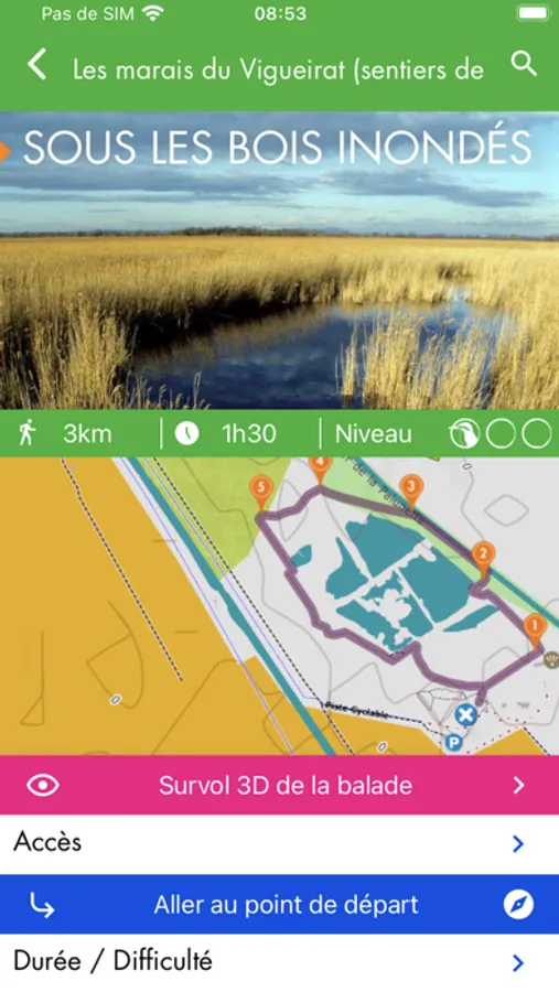 - Survolez : Tous les itinéraires sont disponibles en animation 3D. Appréciez le relief, la végétation, la longueur du parcours... Comme si vous y étiez !