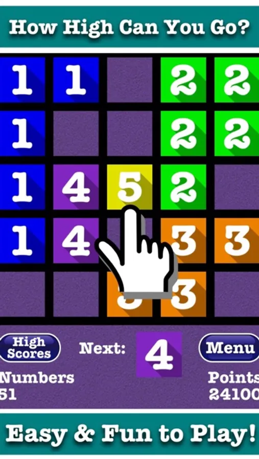 • Just tap to place a number, and then tap on a group of three or more identical numbers to merge them into the next higher number!