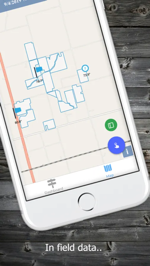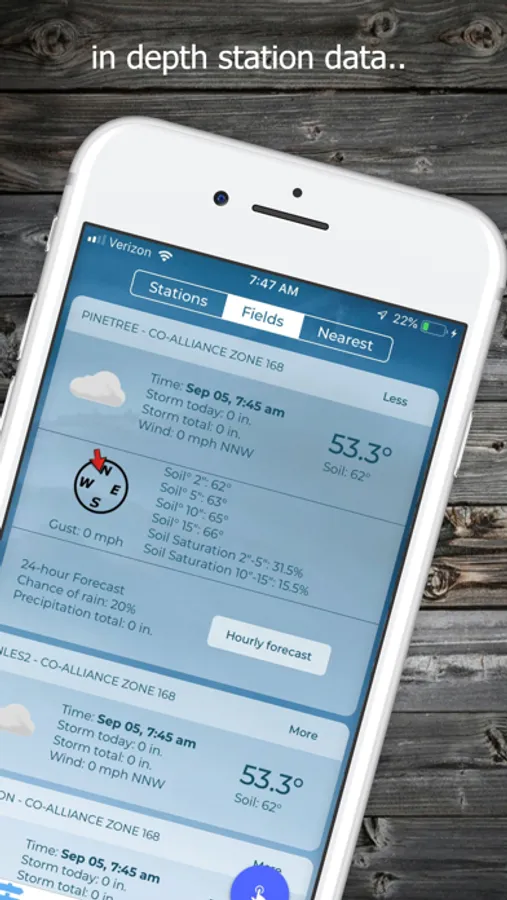 A user interface for DataOnTouch customers to view local weather station data, including current conditions, precipitation, wind speeds, and soil temperatures.