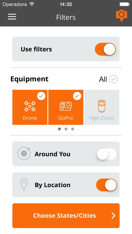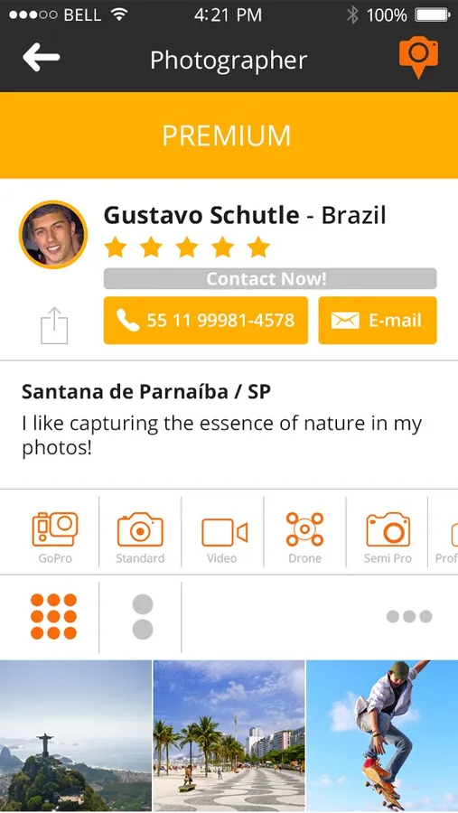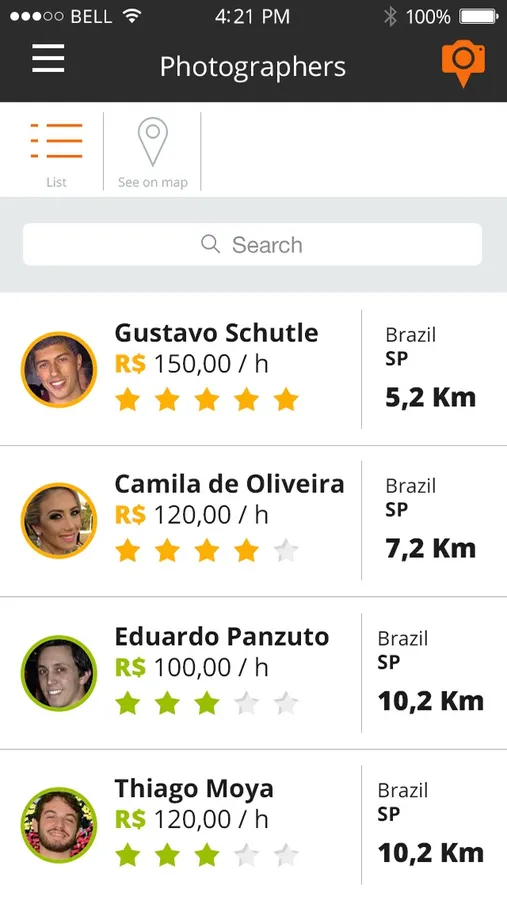 After searching, you will get a list of photographers with their reference prices, distance to you, location and rating and then on the photographer’s profile you may see his registered equipment, specialties, photos examples, ratings from other users and other information that helps you to choose the best one.