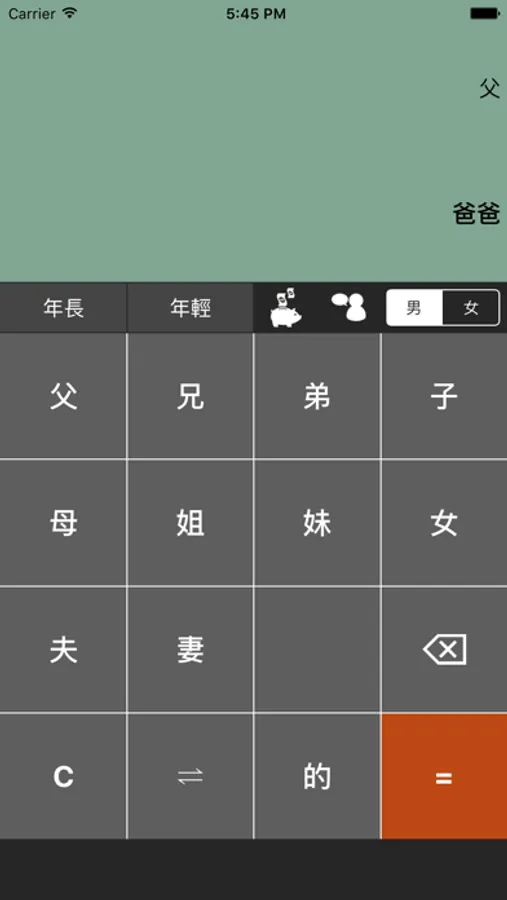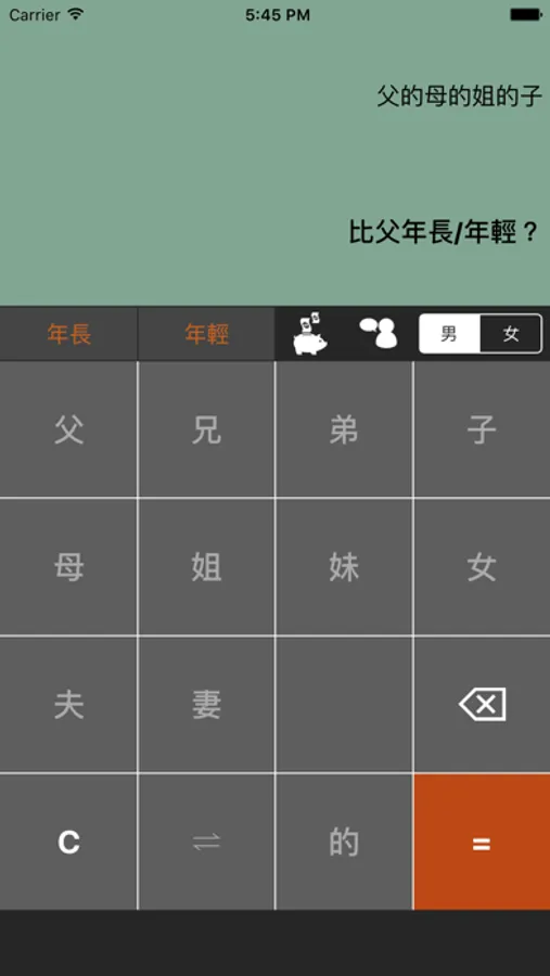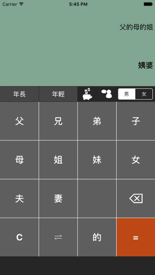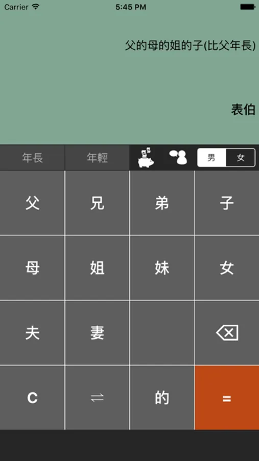 『姨媽姑姐』好似用計數機一樣,輸入您想查詢的親戚關係,例如: