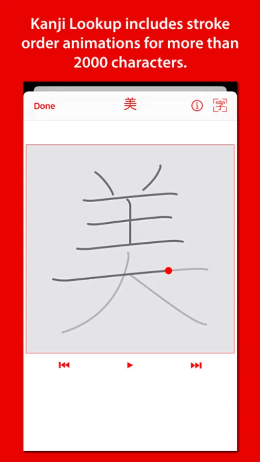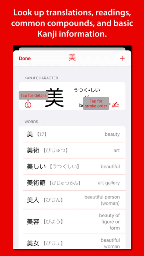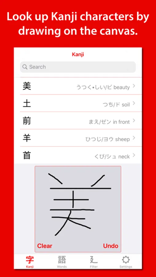This App is not a dictionary or an exhaustive Kanji reference - and nor does it strive to be! Instead, it focusses on - and attempts to excel at - one thing: Finding the meaning of an unknown Kanji character as quickly and easily as possible using the only way that really makes sense on a touch-enable device: by drawing it.