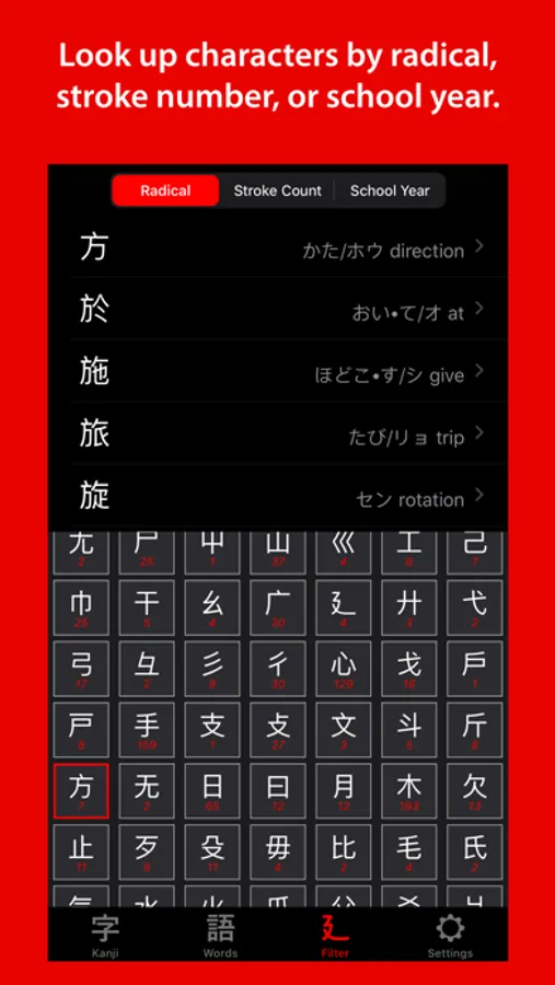 KanjiLookup does not clutter your results with obscure readings only found in the name of that one mountain village or cross-references to paper dictionaries you most likely don't own anyway. Instead, it simply shows you what you are looking for: The character's pronunciation and definition. In addition, a searchable list of the most relevant words containing the Kanji character is only a tap away.