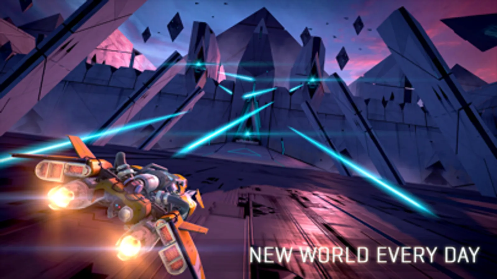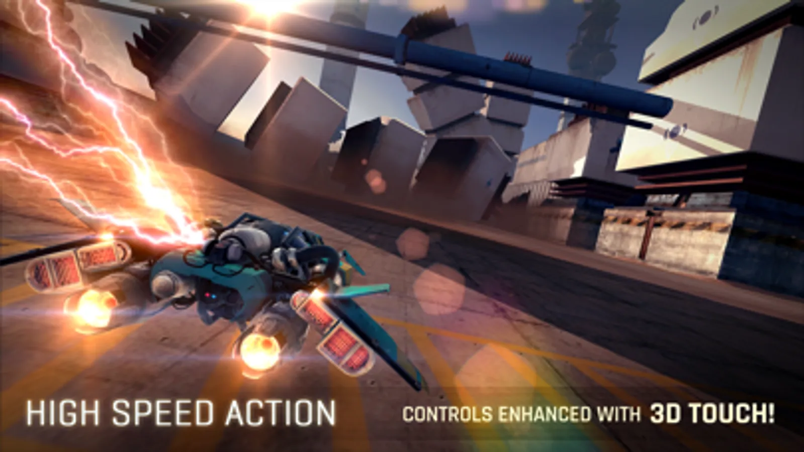Fly at BREAKNECK speed as you pursue your mission and get as far as you can. The world is now occupied by invaders—and they are hunting you. Scramble through unfamiliar terrain, dodging obstacles and evading capture and destruction. Retrace and optimize your route to improve your distance. Test your limits and your control, and earn rewards for the risks you take.