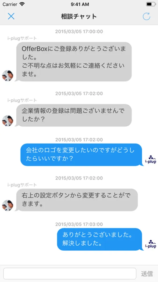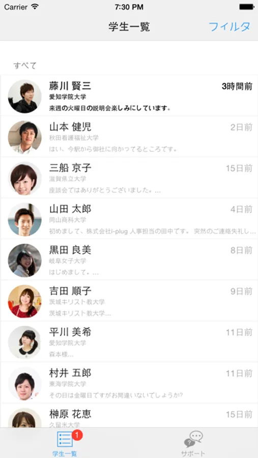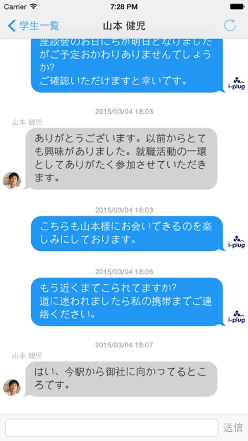 オファーを承諾した学生とメッセージのやりとりが可能です。受信したメッセージはプッシュ通知で知ることができますので、リアルタイム性の高いやりとりが可能です。
