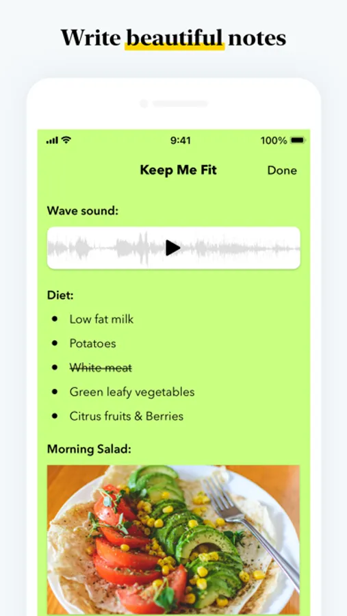 - Write notes. Start with text, add images and sketches, checklists or audio, all in the same note