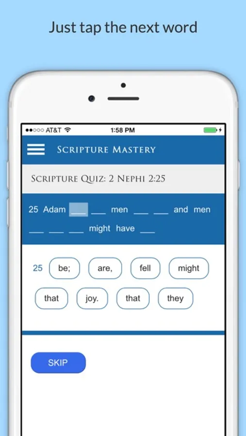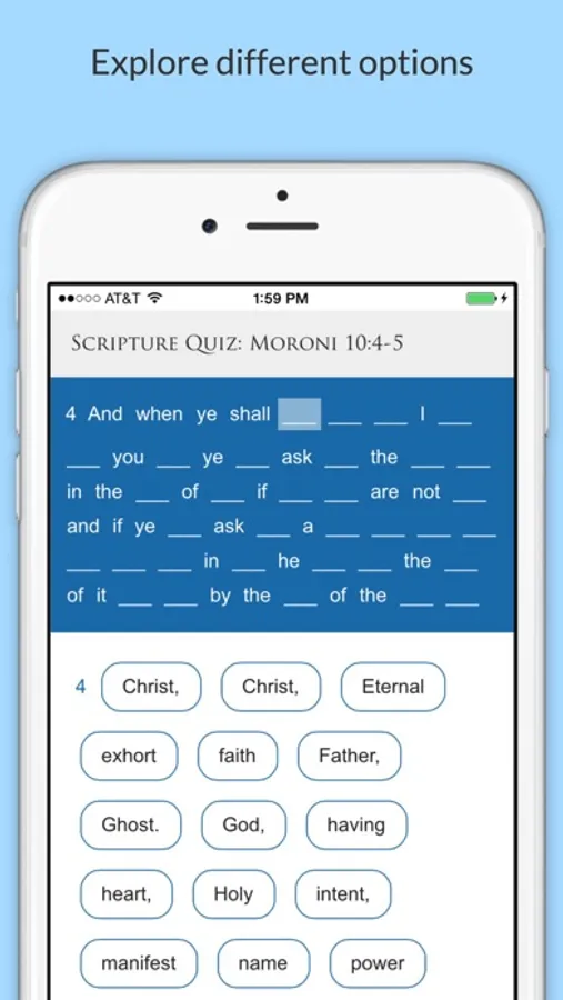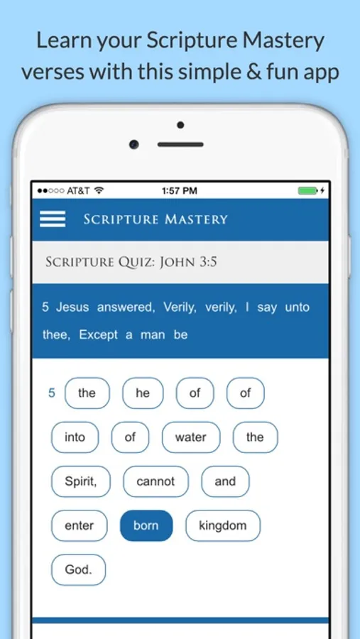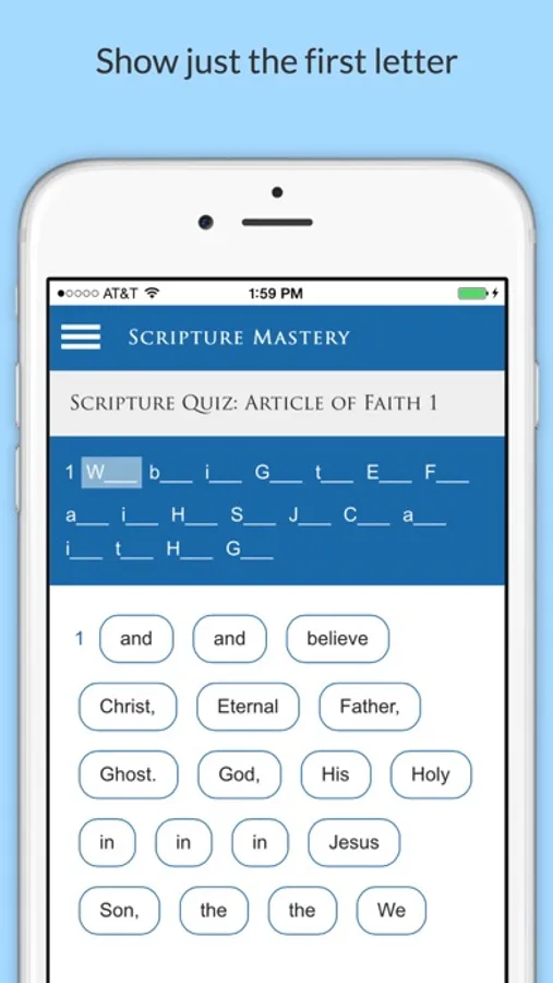 Review all the scripture mastery verses in a clean list on one page, quiz yourself on each of them in multiple ways. This app presents you words from each verse all scrambled, then you tap words in the correct order. Multiple settings for difficulty levels, such as: all words scrambled, only long words, only short words scrambled. Suggest more levels if you can think of them.