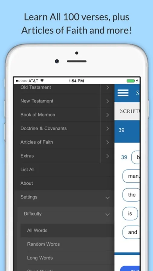 You can also adjust the font size, activate hints (so if you are not sure and tap the wrong words a couple times, the correct word is highlighted to lead you in the right direction), and separate or combine verses (for scripture masteries that include more than one verse).
