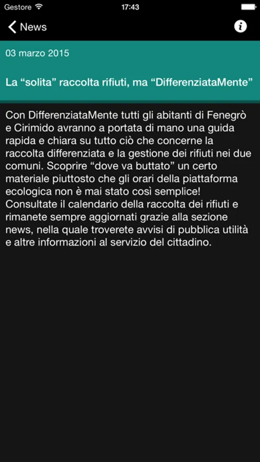 Con DifferenziataMente avrai a portata di mano una guida rapida e chiara su tutto ciò che concerne la raccolta differenziata e la gestione dei rifiuti nei due comuni di Fenegrò e Cirimido. Scoprire “dove va buttato” un certo materiale piuttosto che gli orari della piattaforma ecologica non è mai stato così semplice! Consultate il calendario della raccolta dei rifiuti e rimanete sempre aggiornati grazie alla sezione news, nella quale troverete avvisi di pubblica utilità e altre informazioni al servizio del cittadino.