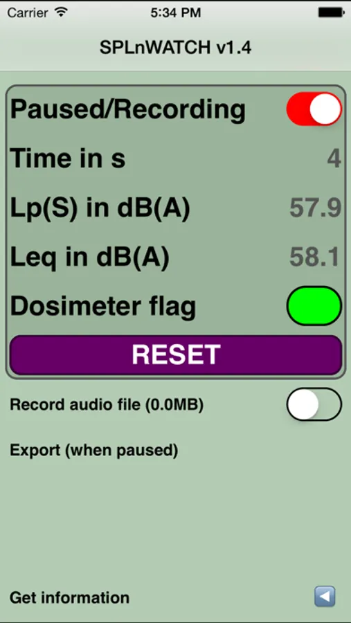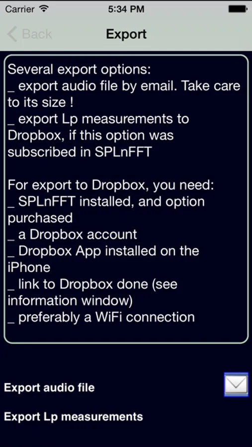 An audio file - which covers the latest active period - can be exported by mail. Take care to disable recording when running this App for a long time: the used storage space can become very huge !