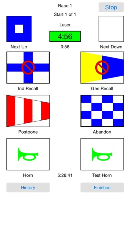 The user interface is intuitive and informative. Just select the desired starting sequence, enter the number of starts for the race and tap "Begin". A digital countdown timer is continuously displayed along with prompts indicating which visual signals need to be raised or lowered and when. This is supplemented with an audible 10, 5, 4, 3, 2, 1 countdown so you won't miss a signal.