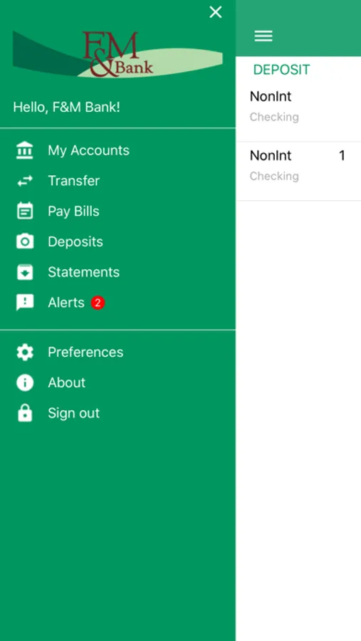 F&M Bank Mobile Banking supports all account types including checking, savings, certificates of deposit, money markets, loans, and lines of credit.