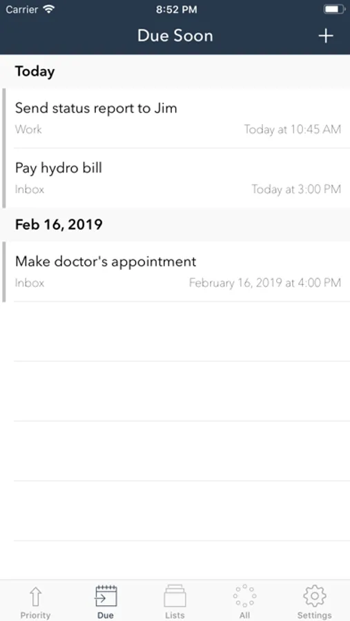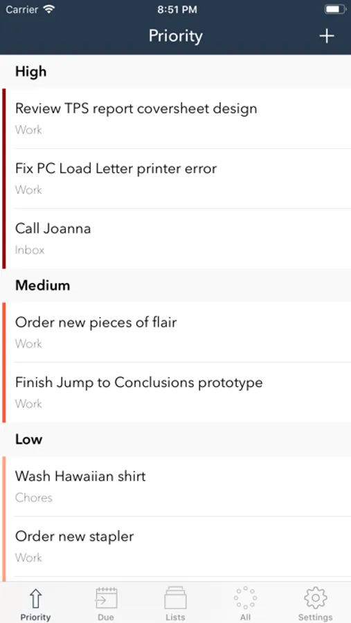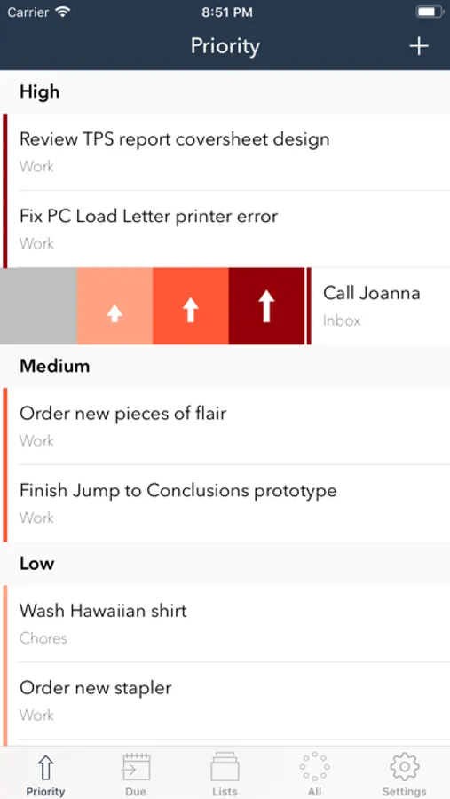 The Priority tab provides you with a quick way to view the tasks you need to focus on right now. The Due tab shows you what is on the horizon. The Lists tab allows you to drill in to a specific list and quickly prioritize the important tasks. The All tab gives you a global view of your tasks to help you get an overview of everything on your plate.