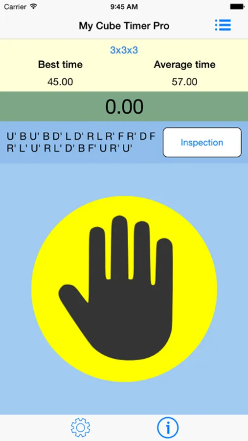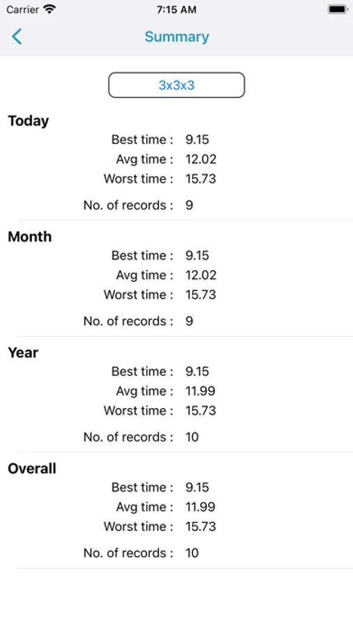 The application records the time for completion of 2x2x2, 3x3x3 or 4x4x4 etc.