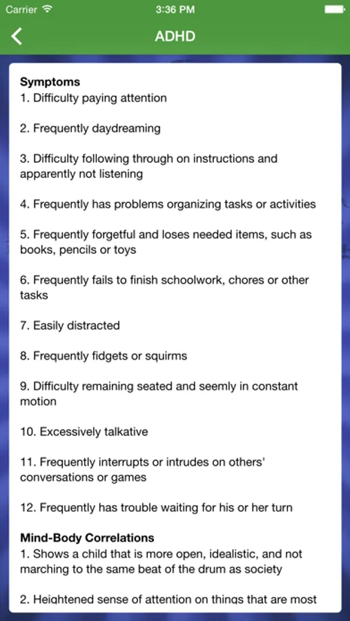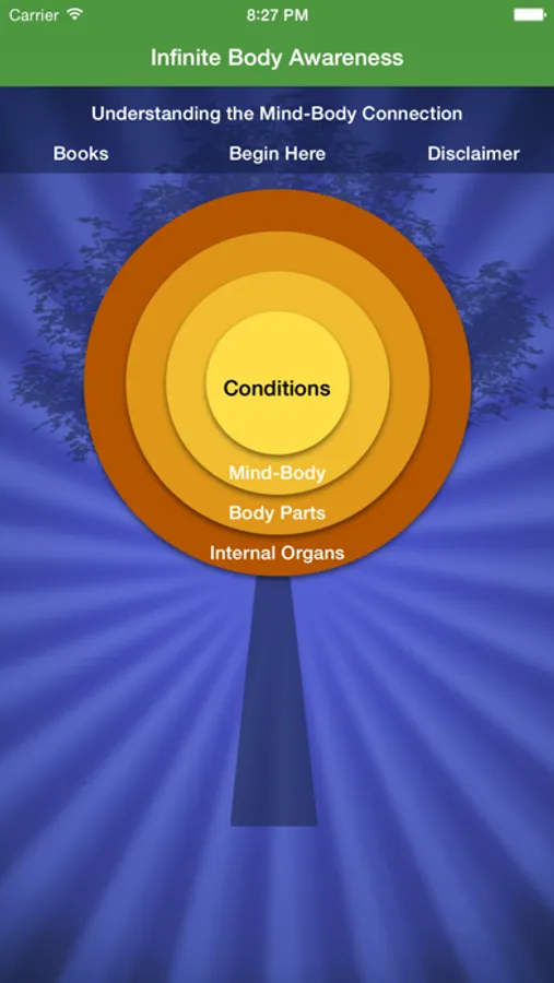 The purpose of the Infinite Body Awareness app, is to give people a resource to discover the mind-body correlations to particular health conditions that affect many people today. The app provides the presenting symptoms of the health conditions, common western medical treatments, the mind-body correlations, and action steps a person can take to address their particular health condition. The app also provides certain mind-body indicators such as what does nerve pain or muscle spasms represent on a mental/emotional level. Going further, explanations of body parts such as the head or feet to help one understand what current life challenges or transitions that are affecting them. Last but not least are the representations of the human body’s internal organs.