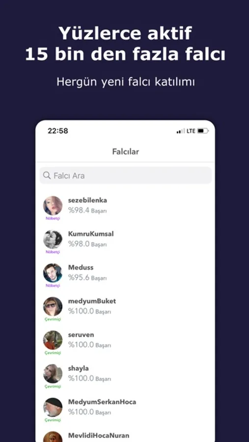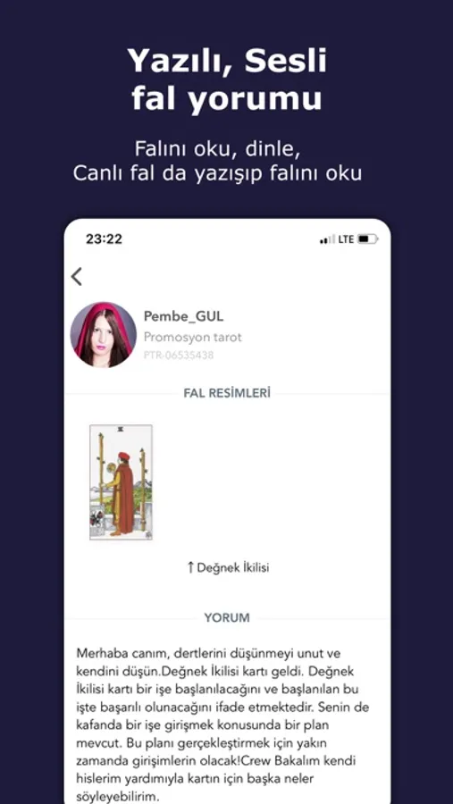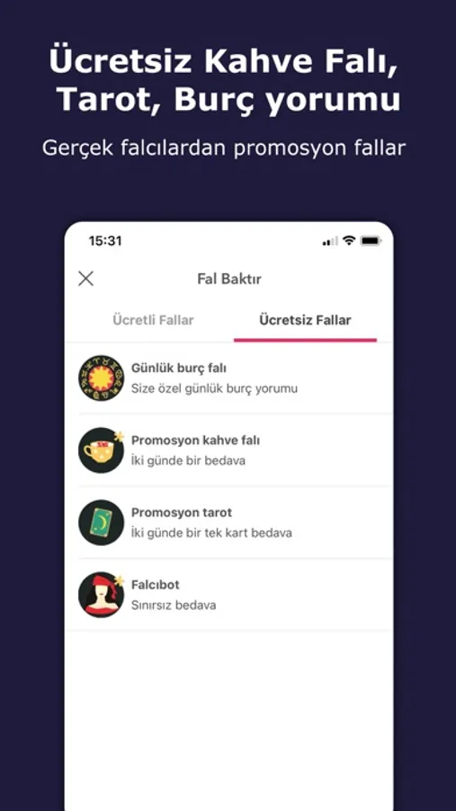 Gerçek falcılara makul ücretlerle reklamsız fal baktırmak artık sadece mobil cihaz kullanarak mümkün. Üstelik iki günde bir ücretsiz kahve falınız ve tarot falınız, telve uygulamasında tamamen bedava. TELLWE CANLI FAL bakan usta falcılar ile bire bir karşılıklı chat yapın. Nöbetçi falcılar 24 saat hizmetinizde.