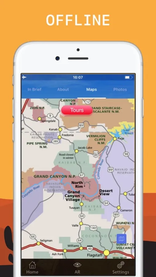 - 5 different maps OFFLINE: Route map, Village and Hermit Road, Desert View Drive, Grand Canyon general map and Hiking trails map.