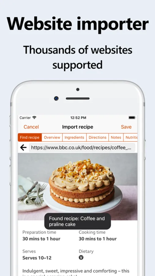 Transfer your recipes from other apps such as Living Cookbook, MasterCook, MacGourmet, BigOven, Cook'n, My Cookbook, My Recipe Book, Paprika Recipe Manager, Pepperplate, OrganizEat, Recipe Box and many more.