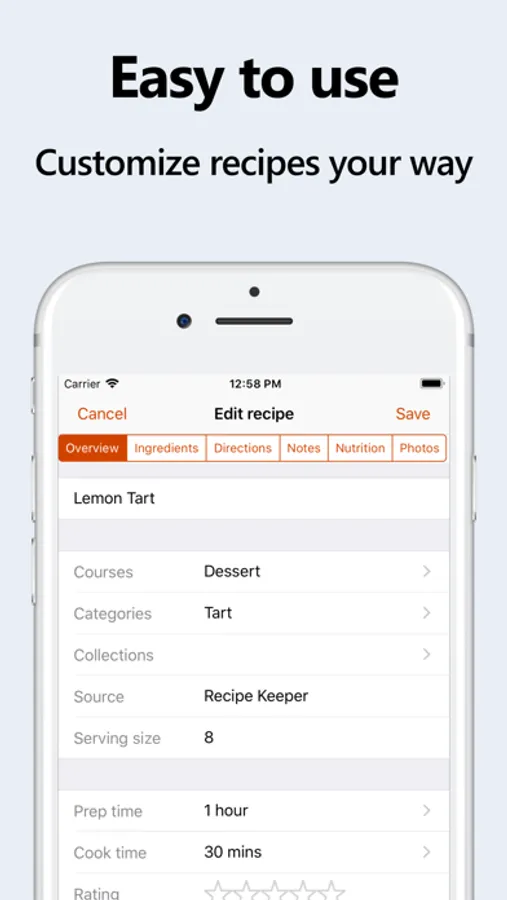 Enter your recipes with as much or as little information as you like. Copy and paste recipes from your existing documents or apps. Categorize your recipes by course and category. Add photos, rate your recipes and flag your favorites.