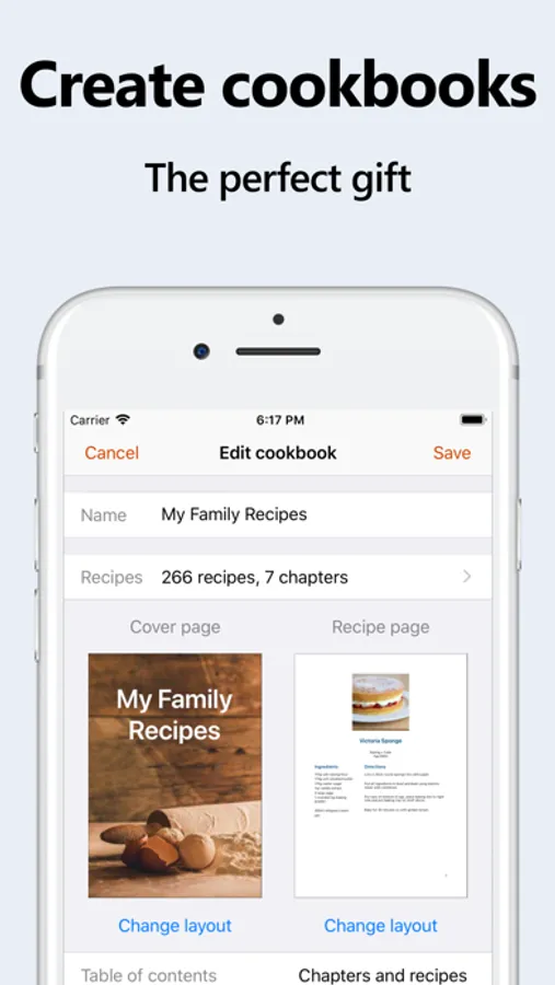 Create cookbooks from your recipes for printing or sharing as a PDF with cover page, table of contents, custom layouts and more.