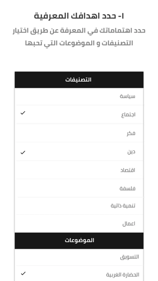 حدد اهتماماتك في المعرفة عن طريق اختيار التصنيفات و الموضوعات التي ترغب في زيادة معرفتك فيها و ستكون هذه اهدافك المعرفية