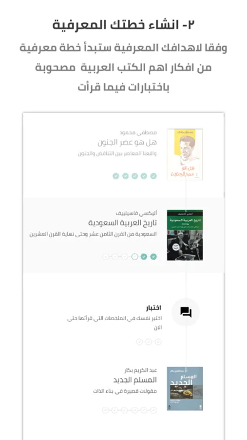 ثقف نفسك عن طريق خطة معرفية من ملخصات اهم الكتب العربية، هذه الخطة أُعدت بعناية حسب اهتماماتك في مجالات المعرفة المختلفة و تتطور مع تطور مستواك , بعد ذلك ستخوض اختبارات فيما قرأت لتحديد مستواك المعرفي الحالي و التأكد من تقدم مستواك المعرفي مع الوقت. هدفنا ان تصبح شخص مثقف، اكثر ثقة بنفسك و تكتسب ثقة الأخرين.
