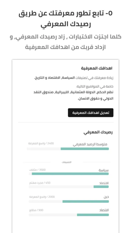عن طريق رصيدك المعرفي تستطيع متابعة تقدم مستواك المعرفي الكلي او في مجالات المعرفة الاخري لتحدد نقاط قوتك و ضعفك، و تتعرف علي المجالات التي تحتاج منك اهتمام و مجهود اكثر.