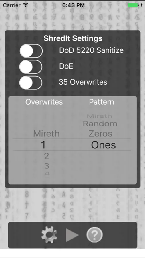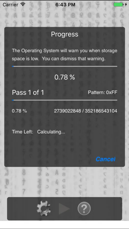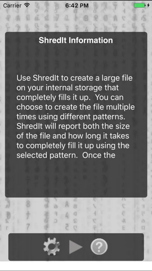 ShredIt Mobile for iOS will write a large file to internal storage of your iOS device. This large file will fill up all the free space on your device and then it will be deleted to free up all the space again. You can configure ShredIt for iOS to perform this multiple times with different patterns. Because the file is unlinked when it is created, if something happens, like your device runs out of battery, the space is automatically returned by iOS.